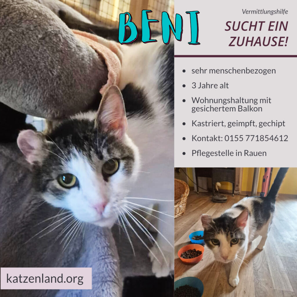 Beni versteht sich gut mit nicht dominanten Katzen und wünscht sich ein Zuhause in Wohnungshaltung mit gesichertem Balkon, damit er auch frische Luft genießen kann. Aktuell lebt er in einer Pflegestelle in Rauen und kann dort kennengelernt werden.