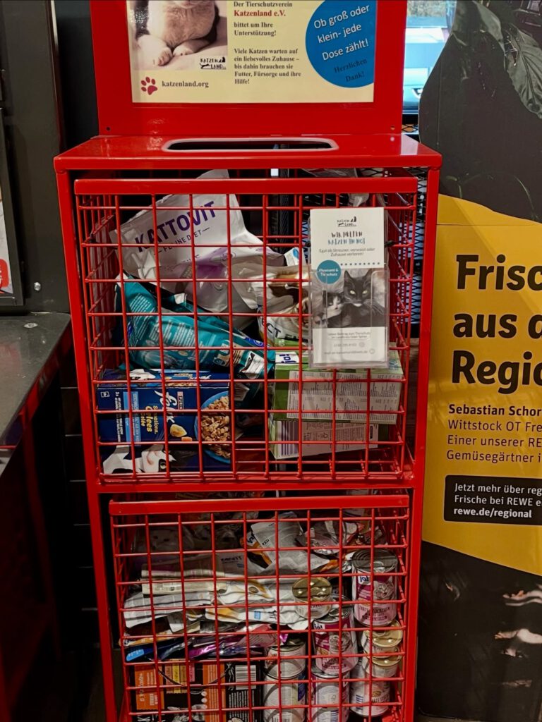 Eine wunderbare Überraschung erreichte uns außerdem vom Sanitätshaus Quenstedt aus Erkner, das uns mit einer Spende von 150 Euro unterstützte. Ebenso freuen wir uns über eine neue Spendenbox im Rewe-Markt in Gosen sowie über zwei große Futterpakete von VETO – Tierschutz.
