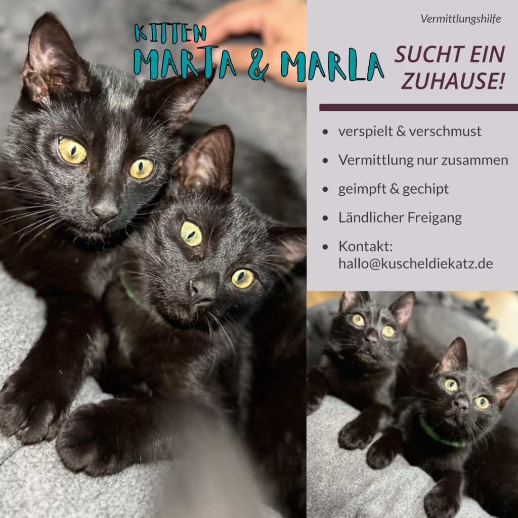 Marta trägt ein silbernes Halsband, Marla ein grünes – sonst sind die beiden schwarzen Katzendamen kaum zu unterscheiden. Sie flitzen durchs Haus, klettern an Fenstergittern hoch, jagen ausdauernd jedem Spielzeug nach – und kennen scheinbar kein Müdesein. Nach dem Auspowern sind sie jedoch voller Liebe: immer in Menschennähe, schnurren ununterbrochen, kuscheln gern und liegen auch zufrieden im Arm.