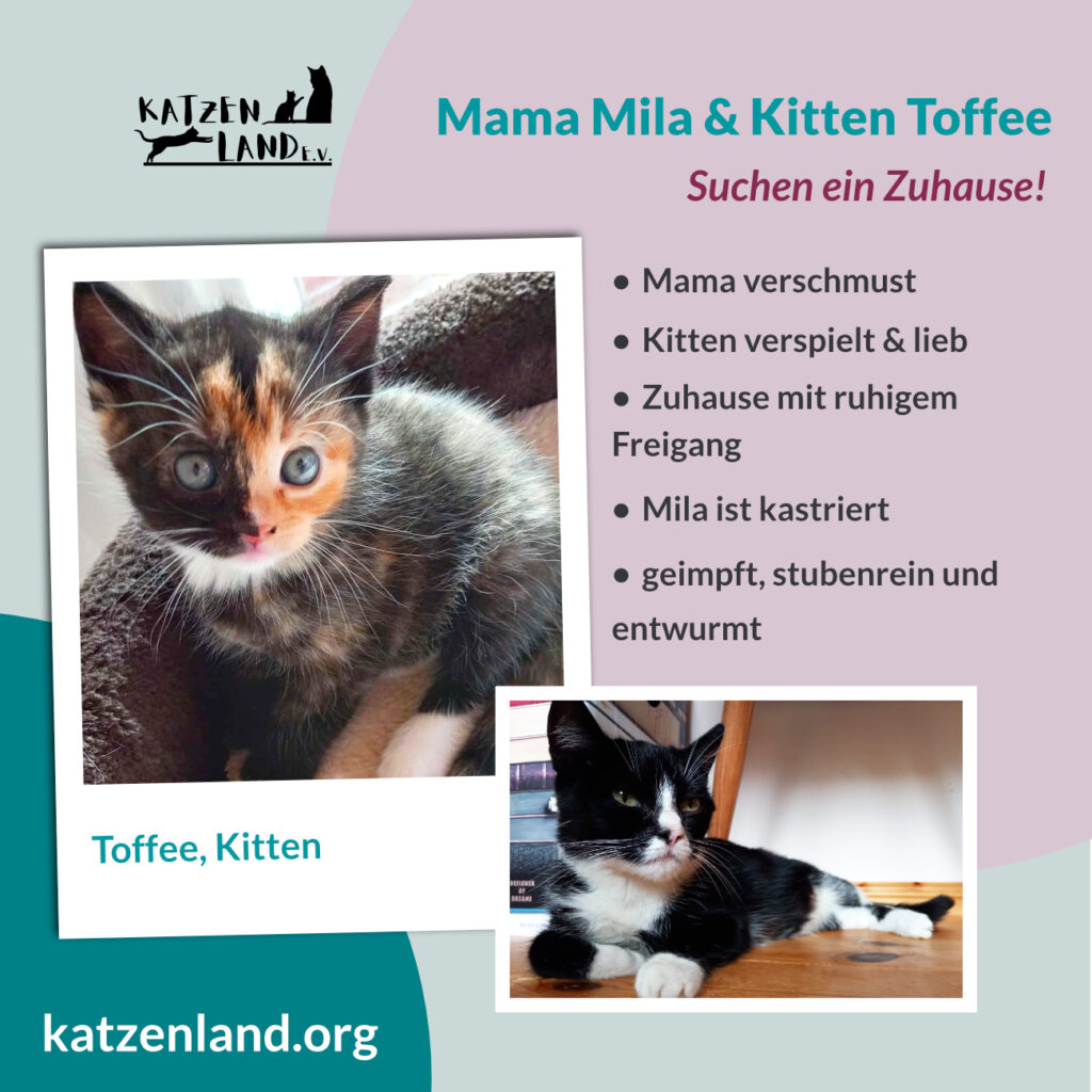 Mama Mila ist eine junge, sehr zutrauliche, ehemalige Streunerkatze die wir mit ihren 4 Wochen alten Kitten bei uns in der Pflegestelle aufgenommen haben. Sie war von Anfang an ganz lieb und hat sich auch rührend um ihre Kleinen gekümmert. Jetzt sucht sie zusammen mit ihrer zuckersüßen Toffee (Mädchen) ein gemütliches und liebevolles Zuhause mit ruhigem Freigang. Die zarte Toffee hat sich in der Pflegestelle ganz wunderbar entwickelt: sie ist gesund, zutraulich und verspielt. Wer möchte diesen beiden Schätzen ein warmes Plätzchen schenken?