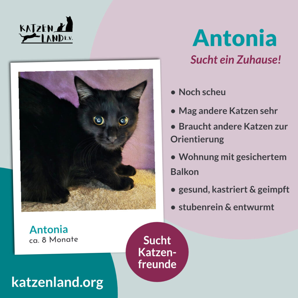 Antonia ist ca. 8 Monate alt und sucht ein ruhiges Zuhause mit anderen Katzen. Sie hatte keinen leichten Start und bleibt bisher Menschen gegenüber zurückhaltend und möchte nicht angefasst werden. Sie ist eine ruhige Beobachterin und braucht viel Geduld. Sie mag andere Katzen sehr und orientiert sich stark an ihnen, was ihr Sicherheit gibt. Antonia sucht ein einfühlsames Zuhause mit gesichertem Balkon, Katzenfreunden, und ohne kleine Kinder. Sie ist eine sanfte Seele, die Zeit braucht – wer gibt ihr diese Chance? 💛