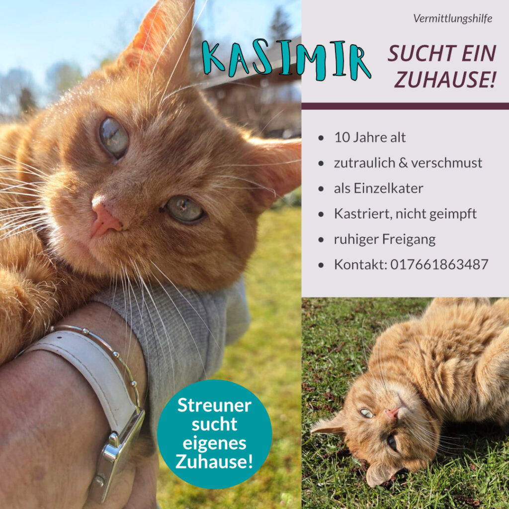 Kater Kasimir lebt seit Jahren als Streuner auf einem Grundstück in Petershagen, wo er regelmäßig versorgt wird. Er ist zutraulich, sehr verschmust und genießt die Nähe zu Menschen. Mit der dort lebenden Katze versteht er sich leider gar nicht, deshalb suchen wir für ihn dringend ein neues Zuhause, in dem er ohne andere Katzen leben darf. Kasimir wünscht sich ein ruhiges Zuhause mit Freigang. Wer gibt Kasimir die Chance auf ein entspanntes und liebevolles Zuhause? 💛