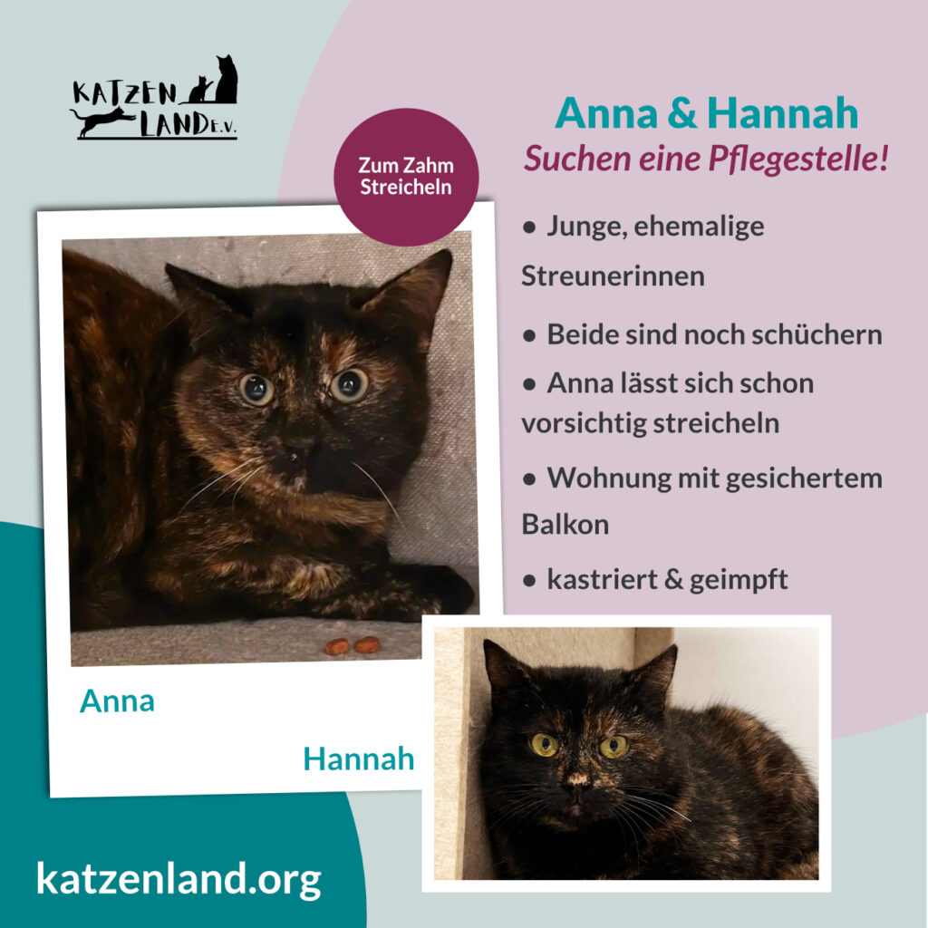 Temporäre Pflegestelle gesucht für Hannah & Anna Die beiden ehemaligen Streunerinnen haben sich im Katzenland gut eingelebt, sind aber noch vorsichtig. Für ihre nächsten Schritte suchen wir eine ruhige Pflegestelle, in der sie weiter Vertrauen fassen können. Anna lässt sich bereits streicheln, Hannah braucht noch etwas Geduld – beide machen aber tolle Fortschritte. Sie sind kastriert, geimpft und entwurmt und bereit für ein liebevolles Übergangszuhause.