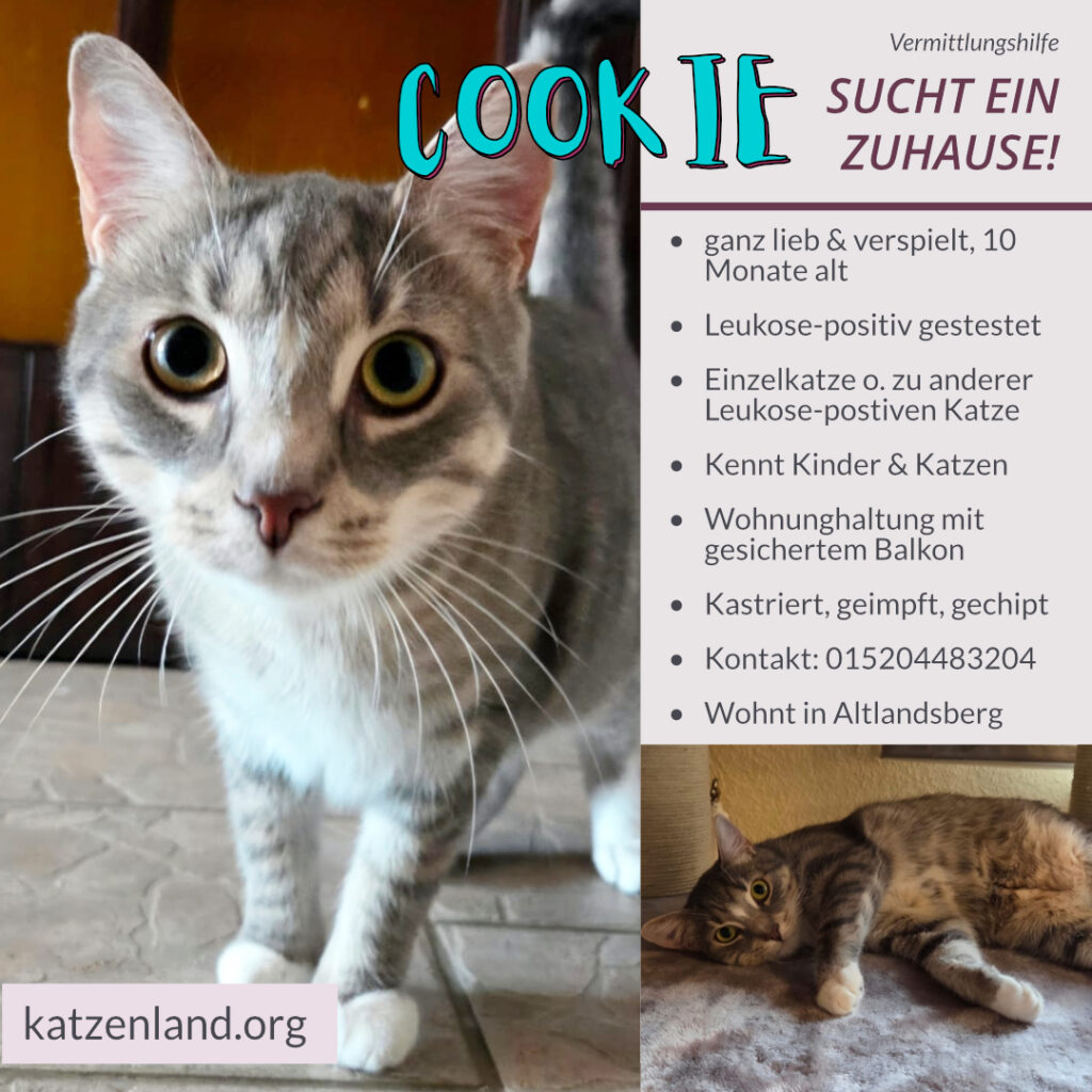 Cookie ist eine ca. 10 Monate junge Katzendame, die anfangs noch etwas scheu ist, nach Vertrauen aber sehr verschmust, verspielt und neugierig wird. Sie kennt Kinder, aber keine Hunde. Aufgrund von Leukose sucht sie ein Zuhause in Einzelhaltung und ohne Freigang– gerne auch zu einer bereits Leukose-positiven Katze oder als Einzelprinzessin. Ihr Bruder durfte bereits ausziehen, Cookie wartet nun noch auf ihr Glück.
