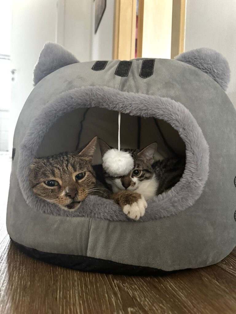 Die kleinen Katzendamen entwickelten sich prächtig, wurden kräftiger, selbstbewusster und wuchsen zu zwei bezaubernden Jungkatzen heran. Ende Juli war es dann so weit: Tiger und Fussel durften gemeinsam in ihr neues Zuhause ziehen. Dort wurden sie herzlich empfangen, und auch wenn es anfangs ein paar kleine Startschwierigkeiten mit ihrer Verdauung gab, haben sie sich schnell eingelebt. Sie verbringen sie die meiste Zeit zusammen – spielen, kuscheln und sind voller Vertrauen in ihre neue Familie.